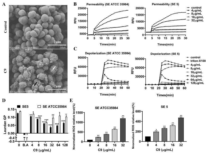 图1. C9表现出对表皮葡萄球菌的杀菌活性,且不易导致耐药。