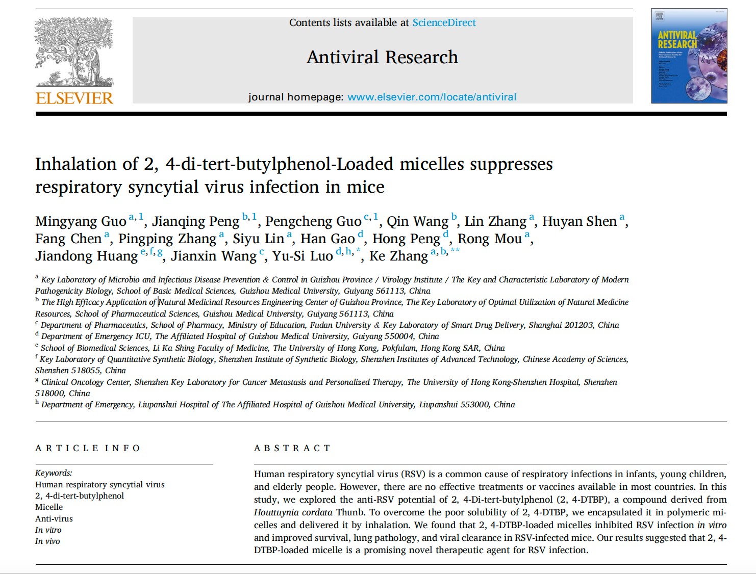 2024年4月,公司病原生物学实验室2020级硕士研究生郭名扬为第一作者,太阳成tyc33455ccwww附属医院罗语思主任医师,太阳成tyc33455ccwww张科副教授为共同通讯作者在病毒学类国际期刊《Antiviral Research》(JCR Q1,中科院2区,影响因子7.6)发表题为《Inhalation of 2, 4-di-tert-butylphenol-loaded micelles suppresses respiratory syncytial virus infection in mice》的研究论著。 该论文获得了国家自然科学基金、贵州省科技厅技术创新团队项目和太阳成tyc33455ccwww附属医院博士启动基金等项目的资助。