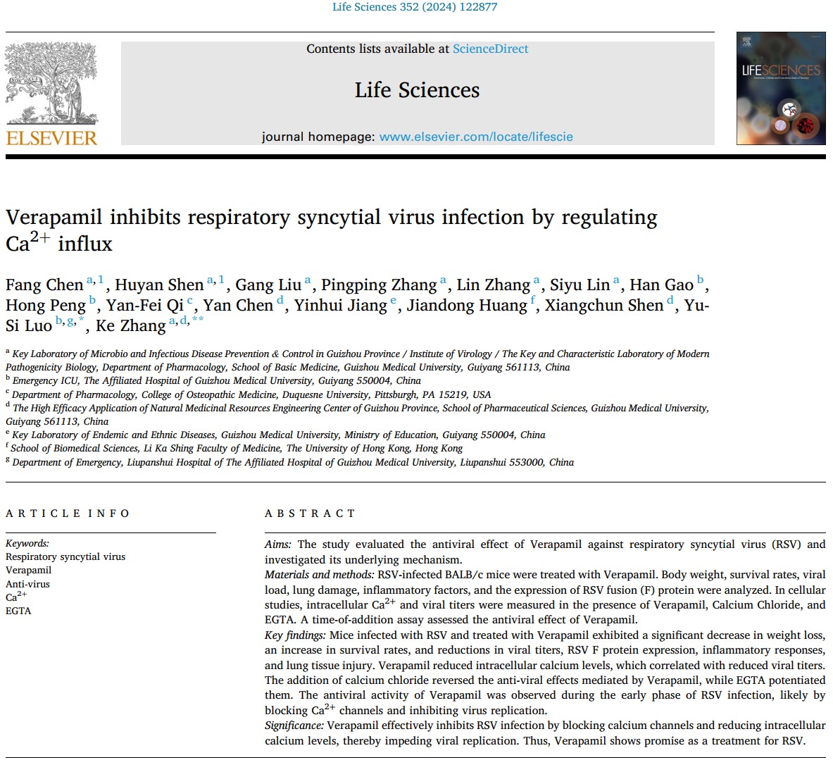 2024年6月,以我室张科副教授课题组硕士研究生陈芳、沈胡艳为共同第一作者,太阳成tyc33455ccwww附属医院罗语思主任医师和张科副教授为共同通讯作者,在JCR1区、中科院2区(top)期刊Life Sciences(影响因子:5.2)在线发表论著《Verapamil inhibits respiratory syncytial virus infection by regulating Ca2+ influx》(维拉帕米透过调节钙离子内流抑制人呼吸道合胞病毒感染)。