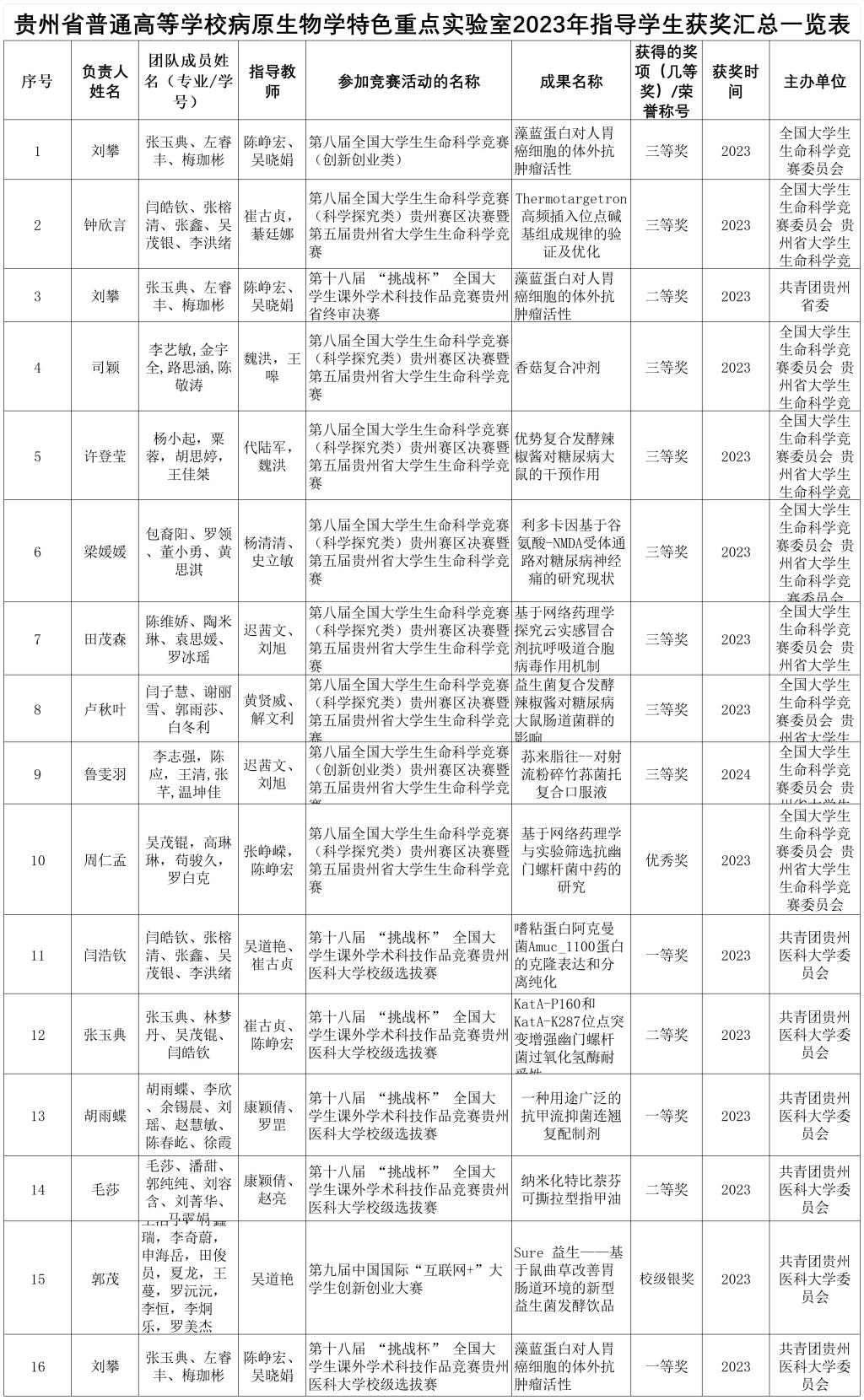 贵州省普通高等公司病原生物学特色重点实验室2023年度指导员工获奖汇总一览表