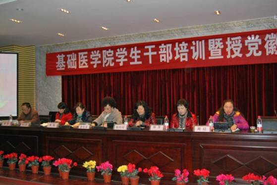 12月9日下午,太阳成tyc33455ccwww员工干部培训暨授党徽仪式在基础二号楼会议室举行。贵阳医公司党委宣传部部长金也非,学工处处长周嫆,后勤党总支书记张玲玲、副总经理郝萍,基础医公司党委书记张红霞、副书记周红、副经理曾柱出席本次活动,基础医公司党委副书记周红主持会议。贵阳医公司党委宣传部部长金也非首先作动员讲话,讲话围绕“员工干部应该具备什么样的素质”这一中心话题开展,强调员工干部应具备思想道德素质、科学文化素质、良好的心理素质和较强的工作能力。后勤党总支书记张玲玲围绕“后勤工作与员工干部工作”开展,使员工干部进一步明确工作的要求与方法。基础医公司党委书记张红霞对员工干部培训进行了部署。本次员工干部培训以讨论、座谈、素质拓展等形式培训,培训活动对员工干部正确处理学习和工作的关系,对提高政治觉悟,强化心理素质,强化服务意思和奉献精神起到积极的作用。员工代表雷琳同学围绕“责任、目标和选择”表达了员工干部的意愿与信心。紧接着与会领导、和辅导员对员工新党员进行授党徽仪式,党员们在党旗下庄严宣誓。