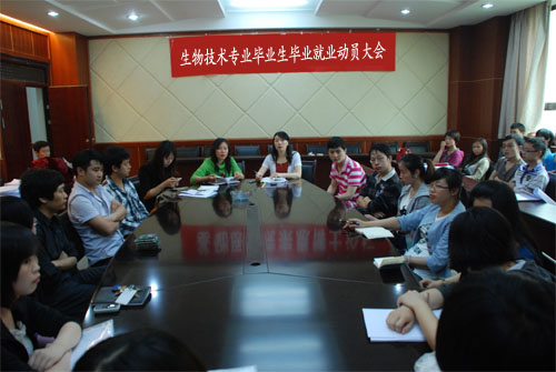 2012年5月4日上午,在基础二号楼三楼会议室召开了2012届医员工物技术毕业生就业工作会,基础医公司党委书记张红霞、副书记周红、辅导员李尔舒及医员工物技术2007级毕业生参加了动员会,动员会由党委副书记周红主持。