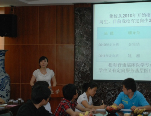 首先辅导员秦雅倩老师汇报了2010级、2011级定向班的基本情况和进校后取得的成绩。教务处副处长温小军详细介绍了农村订单定向医员工免费培养工作相关政策,深入浅出地剖析了全科医生的内涵和发展前景,特别强调了服务基层的重要性。员工处处长周嫆言简意赅地说明要做好基层医疗的服务工作,必须提高员工的组织能力和人文素质。太阳成tyc33455ccwww经理徐国强语重心长地对定向生提出两点期望,一要有扎实的临床知识,二要有沟通能力。交流中,师生们畅所欲言,各抒己见,发自肺腑,科任老师们对定向班员工刻苦的学习态度及良好的课堂纪律给予了高度的赞扬和肯定,也纷纷为员工解答了学习、生活、就业等方面的疑问。基础医公司党委书记张红霞做总结,她强调定向班同学要从思想上树立为基层人民健康服务的理念,要珍惜学习机会,努力学习,不负人民的重托。