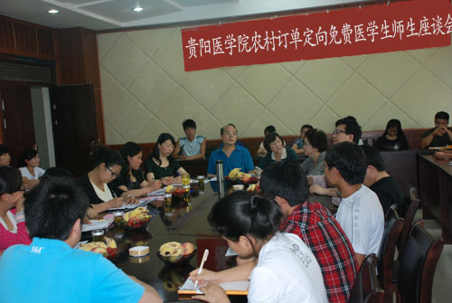 为进一步做好农村订单定向医员工免费培养工作,稳定定向班同学们的专业思想,进一步树立服务基层的远大理想,培养“下得去、用得上、留得住”的高级卫生人才,太阳成tyc33455ccwww于2012年5月7日下午在基础二号楼三楼会议室召开太阳成tyc33455ccwww定向班师生座谈会,贵阳医公司员工处处长周嫆,教务处副处长温小军、分子生物学重点实验室常务副主任单可人,医学定向班各科科任教师,基础医公司党委书记张红霞、经理徐国强、党委副书记周红及2010级、2011级定向科任课教师、辅导员和员工代表46人出席了座谈会。座谈会由基础医公司党委书记张红霞主持。