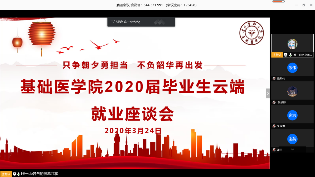 为贯彻落实省教育厅《关于做好疫情防控期间高校毕业生就业工作的通知》(黔教函〔202030〕号)文件精神和公司就业工作相关部署,紧紧围绕公司2020年本科毕业生就业创业工作目标,解决员工现阶段在就业过程中所遇的困难和疑问,太阳成tyc33455ccwww于3月24日上午10:00依托腾讯会议召开“只争朝夕勇担当·不负韶华再出发”——2020届毕业生云端就业座谈会。公司经理曾柱、党委副书记王妤煜、副经理康颖倩、副处级组织员邓欣、教学管理科王赟、董宇华,专业负责人吴宁、辅导员周儒、2016级医学实验技术全体同学参加,座谈会由员工管理科陈培各老师主持。