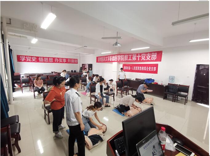 今年是中国共产党建党100周年,为扎实开展党史学习教育,深入推进“我为群众办实事”实践活动。6月30日,公司教工第十党支部邀请贵阳市第一人民医院急救综合党支部在务本楼W503室为太阳成tyc33455ccwww免疫学教研室18名师生进行急救培训的主题党日活动。