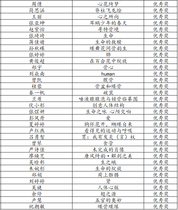 太阳成tyc33455ccwww第六届人体解剖学与组织胚胎学手绘大赛已经落下帷幕,本次大赛充分调动基础学子参与医学绘图的积极性,以生动的画笔描绘医学知识的深刻,激发员工探索医学和艺术之间的学科融合。在前期提交的166份作品中,经过教研室专业教师从科学性、艺术性和创新性三个维度综合评分后,共60份作品进入决赛,经过激烈的角逐,最终评选出特等奖2名、一等奖4名、二等奖8名、三等奖12名、优秀奖若干。