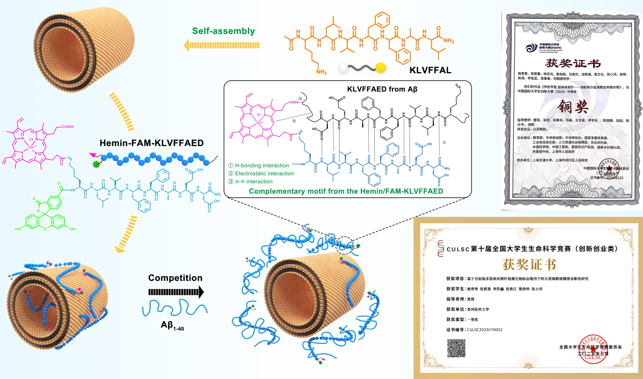 图示:肽自组装荧光纳米平台用于检测和抑制Aβ聚集的示意图及获奖证书。
