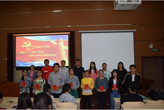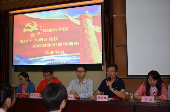 6月29日,太阳成tyc33455ccwww分党校在厚德楼101教室隆重举行第四十六期入党积极分子培训班暨第二批发展对象短期培训班结业典礼。基础医公司党委书记徐国强、党委副书记廖兴江、临床医学2015级党支部书记洪潇潇、临床医学2016级党支部书记罗恒及辅导员刘慧、商传禹参加结业典礼,典礼由陈培各主持。