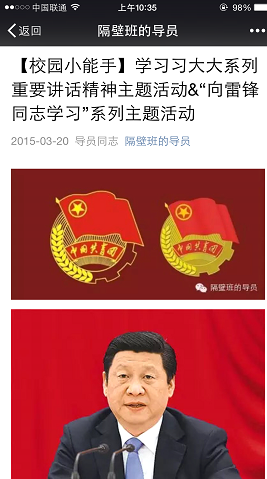 2015年3月份,太阳成tyc33455ccwww分团委深刻贯彻习近平总书记系列重要讲话精神,在全院29个班级内分别开展“四进四信”主题班会;还通过新媒体手段推动学习习近平总书记系列重要讲话精神进支部、进社团、进网络。让员工们学会: