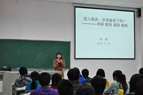 为进一步促进2013级卓越医师班员工对临床专业的深入了解,尽早明确今后努力的方向与目标,增强卓越医师班员工学医的坚定信念,医员工物工程系团委副书记杨晖老师应卓越班深情相邀,于20131115日下午4:304308教室,给卓越班全体同学进行了以“进入临床,你准备好了吗?——考研推免 规陪 执照”的主题讲座,讲座由卓越班班主任董然然主持。