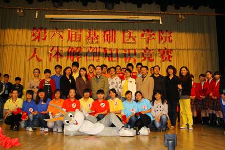 为帮助同学们巩固专业知识,提高同学们学习的积极性、主动性,丰富第二课堂,太阳成tyc33455ccwww于2012年6月4日晚19点在大礼堂举行“第六届人体解剖学知识竞赛”。此次知识竞赛由基础医公司党委主办,临床2011级党支部、人体解剖学教研室及人体解剖学实验室中心、教工第七党支部承办。基础医公司党委书记张红霞、经理徐国强、党委副书记周红、副经理曾柱、副经理席晓岚及人体解剖学教研室、人体解剖学实验中心老师以及临床医学2011级的师生参加了本次活动。