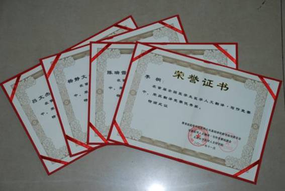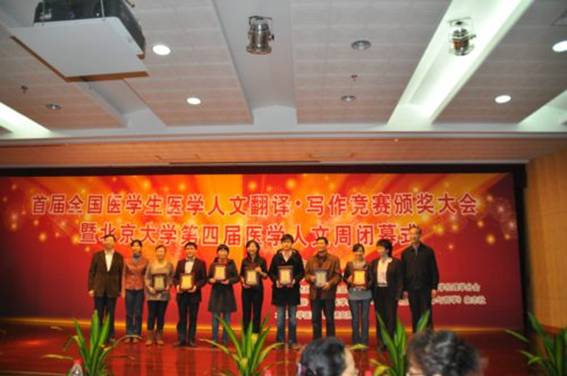 2011年11月10日,首届全国医员工人文翻译•写作竞赛颁奖仪式在北京举行。本次竞赛由教育部高校医药公共基础课程教学指导委员会、中国自然辩证法研究会医学哲学分会、中华医学会医学伦理学分会、健康报社、《英国医学杂志(BMJ)中文版》杂志社、《医学与哲学》杂志社、北京大学医学人文研究院等机构组织联合主办。来自国内25所医公司校近两千名员工提交了参赛作品。公司员工在太阳成tyc33455ccwww副经理曾柱博士的指导下积极参赛,经大赛评委会评审,陈瑞雪、李桐、杨静文、吕文杰4名同学荣获翻译竞赛优秀奖,太阳成tyc33455ccwww荣获优秀组织奖。