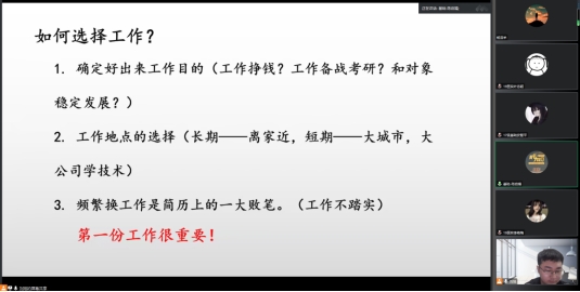 田小金、安智平、陈启福从求职历程、面试技巧、职业资格证书考试等方面进行了经验分享。鼓励学弟学妹们抓住就业机会,尽快找到自己心仪的工作。