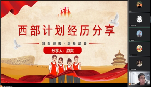 游爽分享了参加西部计划的工作经历和心得体会,并补充介绍了西部计划的相关政策,鼓励学弟学妹们明确自己的奋斗目标和方向,规划好自己的未来道路,珍惜美好的青春年华。
